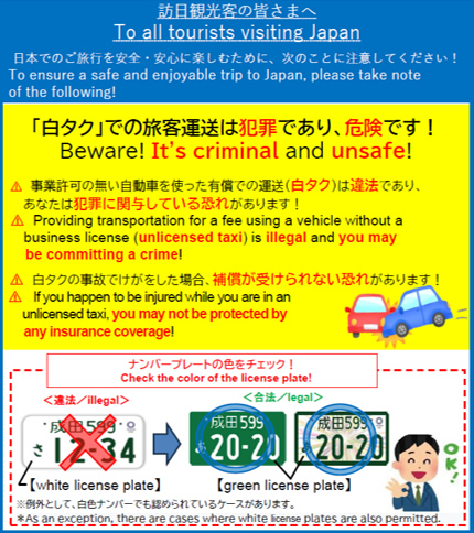 このような車両は、国土交通大臣の管理が及ばないため、運行管理体制などが杜撰で、重大交通事故を起こす可能性が高く、万一交通事故で怪我をしても補償されない場合がありますので、安易に利用しないよう注意してください。