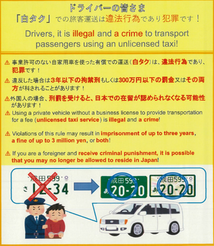 白タクとは、国土交通大臣の許可を受けないで、自家用車やレンタカー(白色ナンバー)を使用して、有償で人を運送する車両を言います。